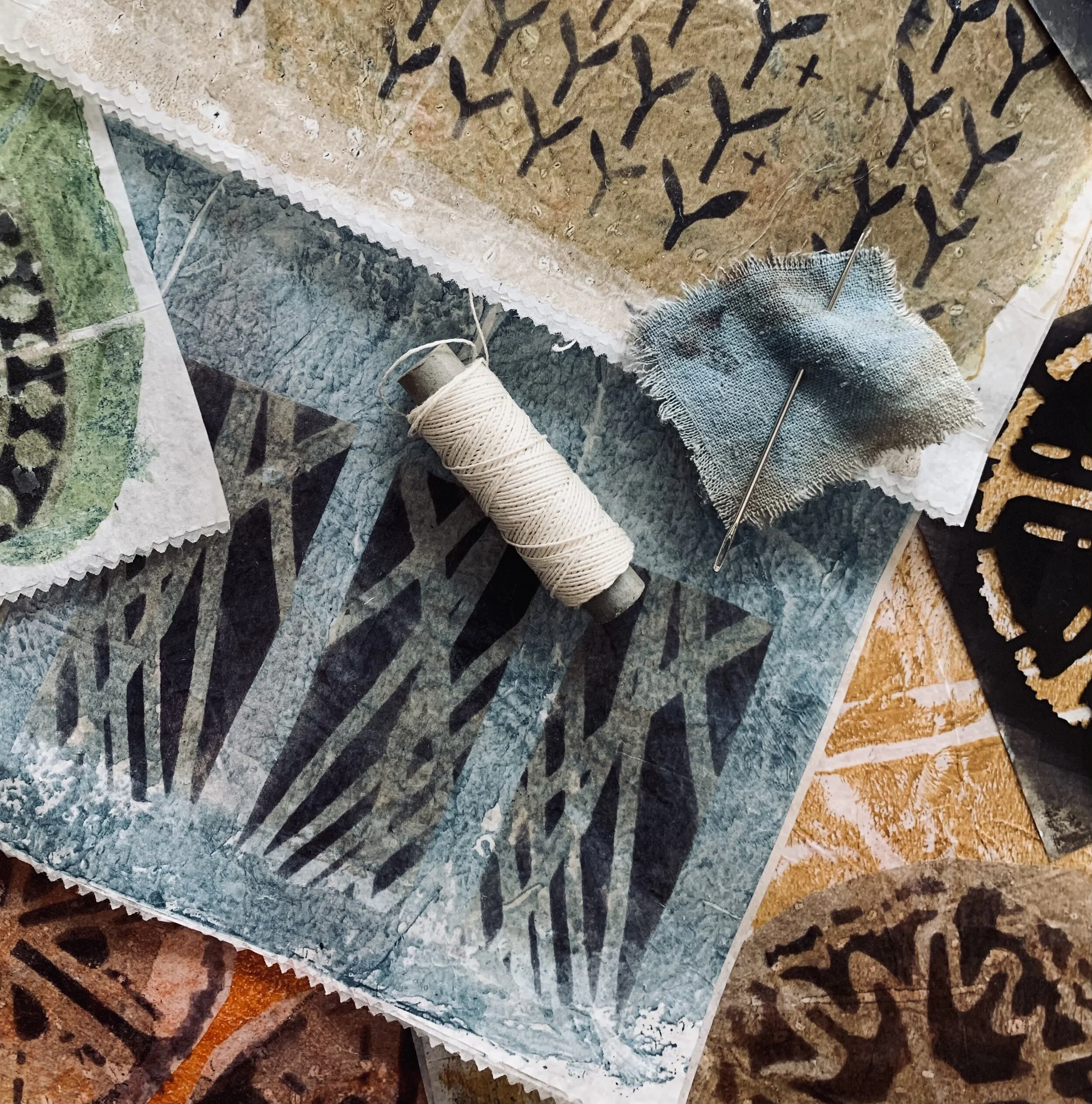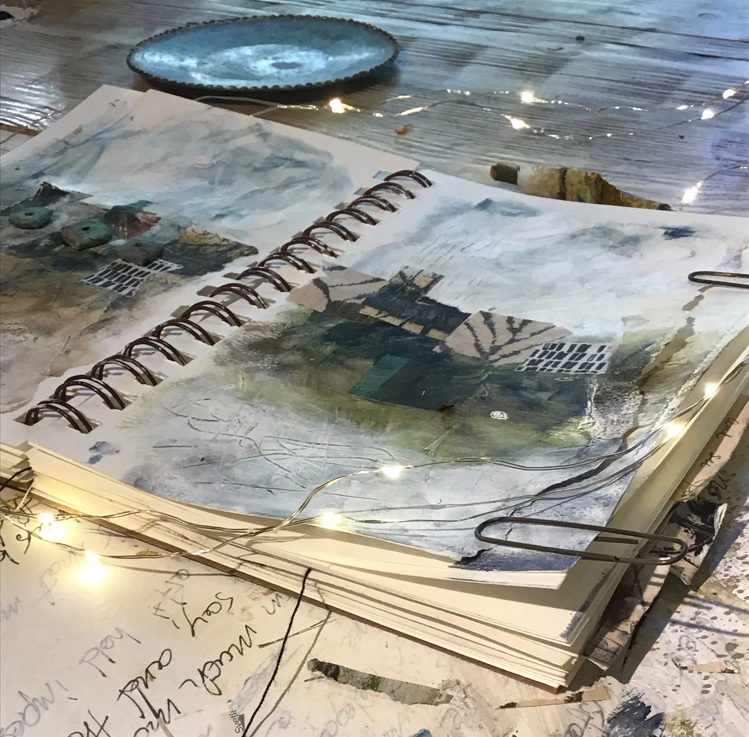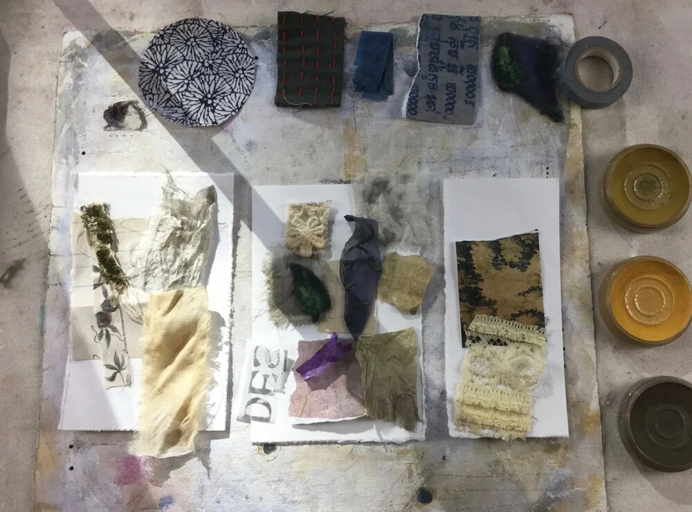 Join me in my studio as layer after layer of fabric or papers are added to a simple piece of watercolor paper, folded twice making three sections, and adhered to the board.
